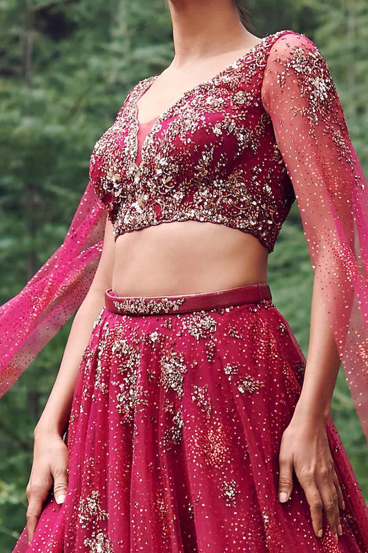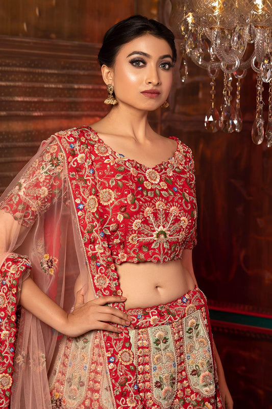 Red Dupion Silk Hand Embroidered Floral Applique Bridal Lehenga Set