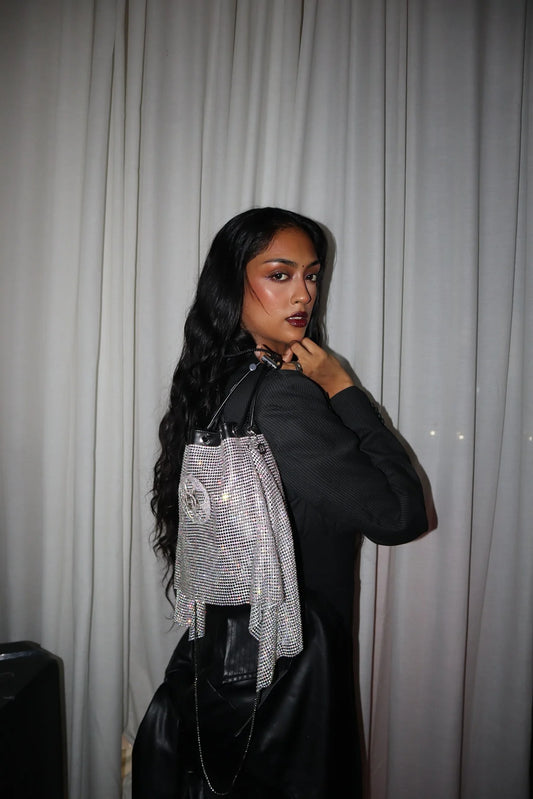 THE CRYSTAL POPPI BUCKET BAG IN STARDUST SILVER