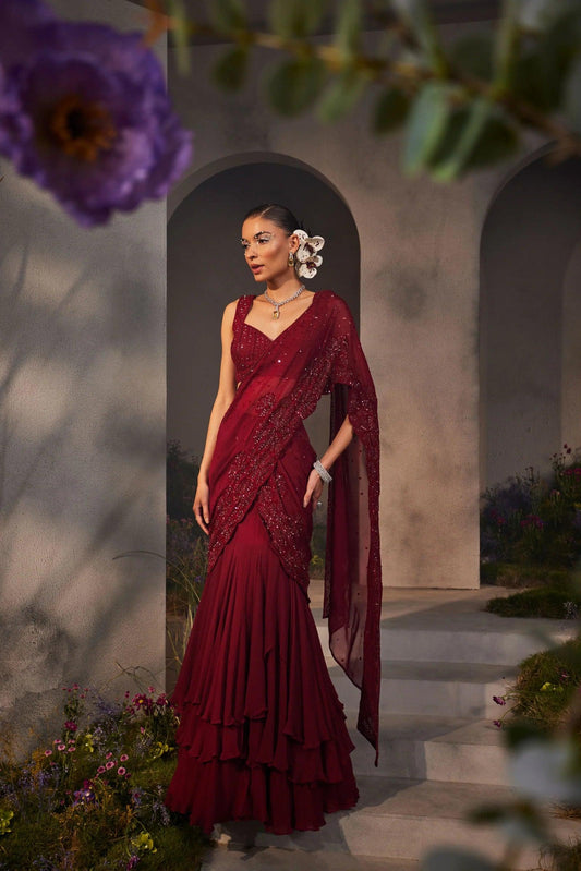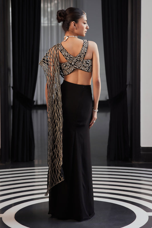 Black Taffeta Net Georgette Embroidery Fiore Jaal Pre-Draped Saree and Blouse