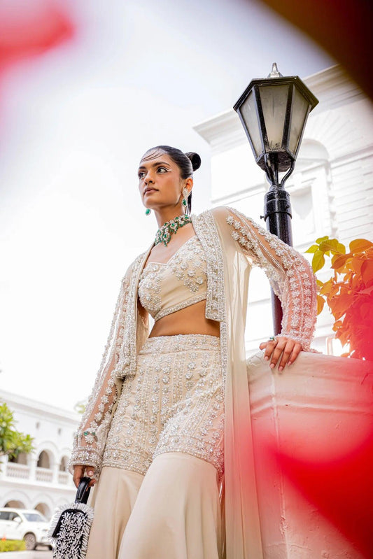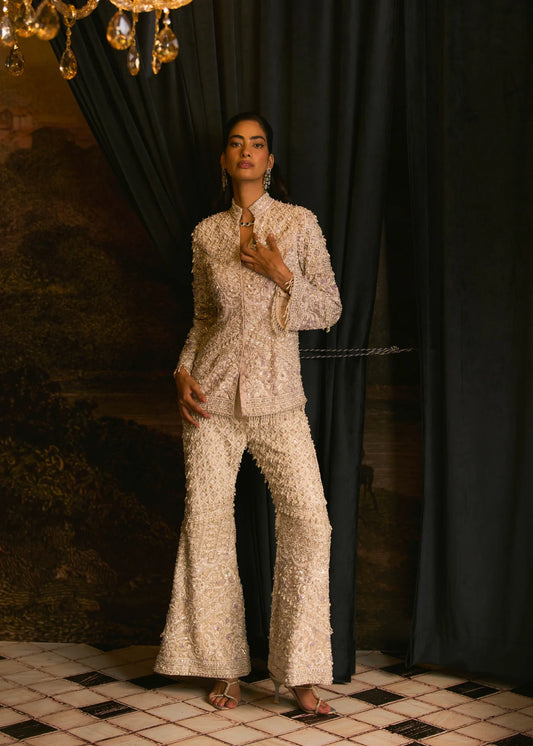 Hélène Oat milk bustier, jacket & palazzo set.