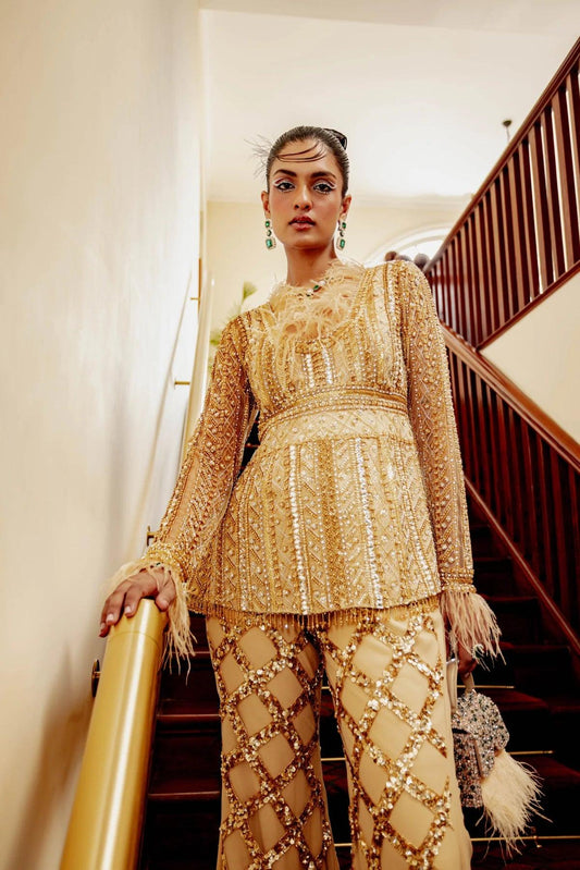 Charlotte Venetion gold embroidered peplum top & flared embroidered pants