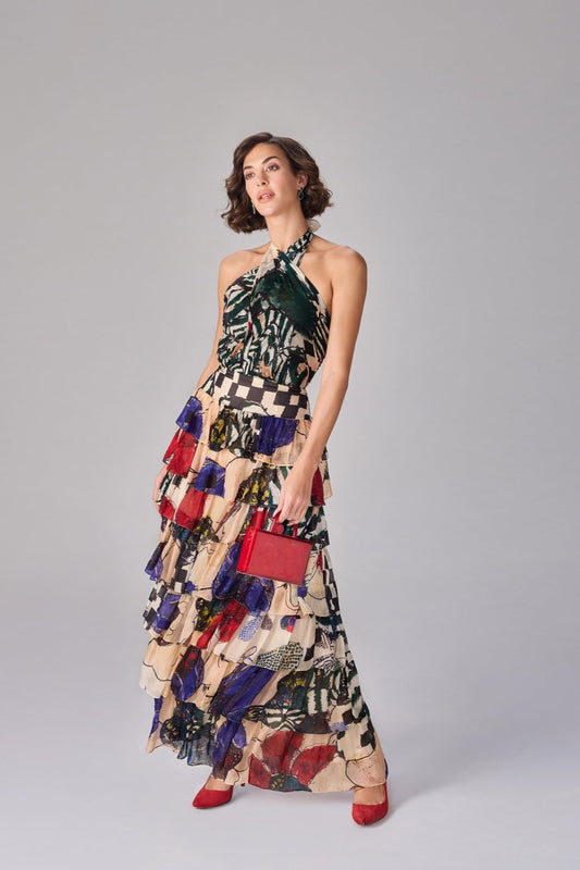 Periwinkle Bandhani Print Halter Style Maxi Dress