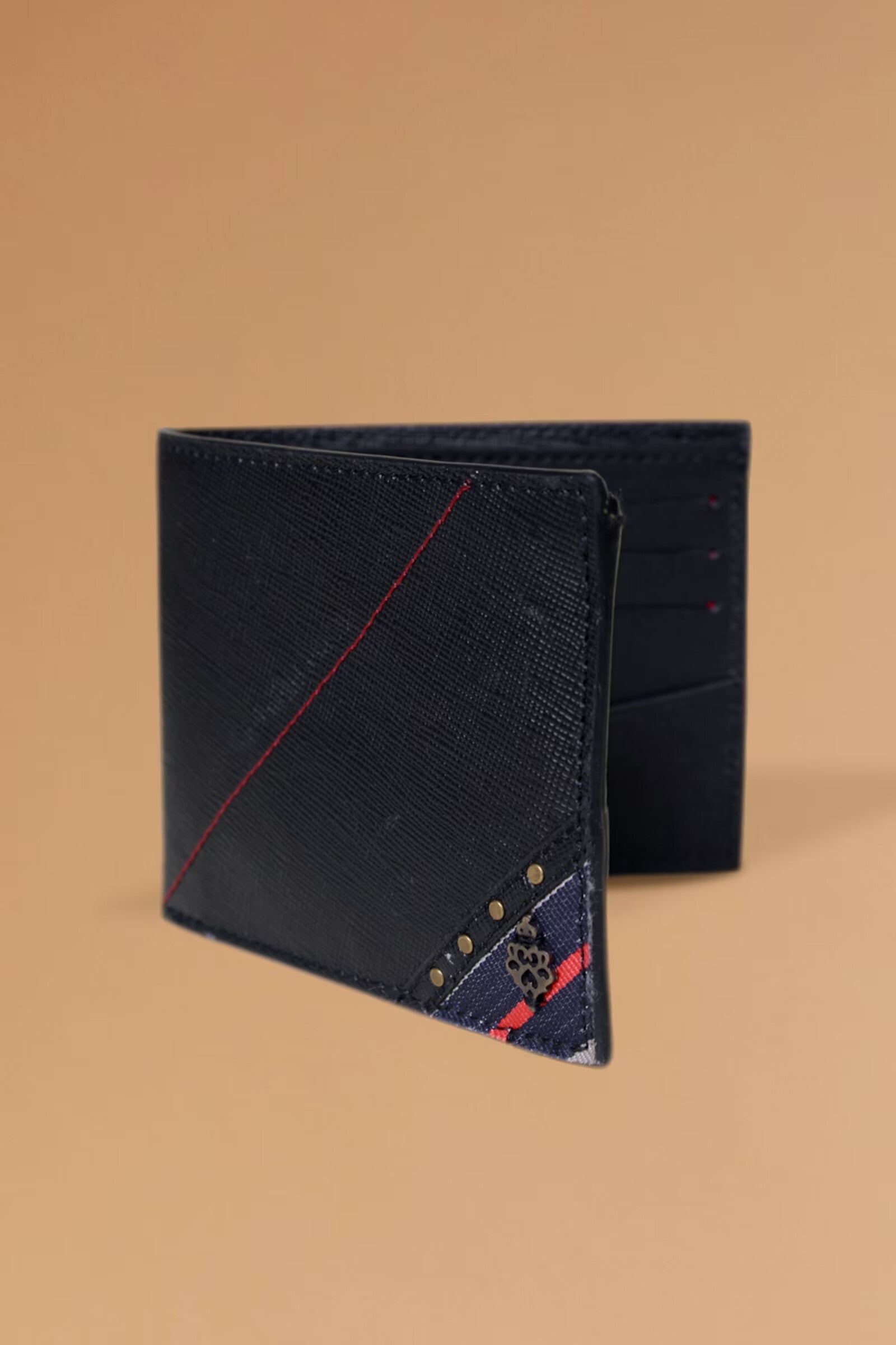 A sleek and modern Ammo Bifold Wallet distinguished by corner-details embraced with round-studs in Antique Gold and woven Independence trim. It further presents inner slots crafted in genuine leather.
