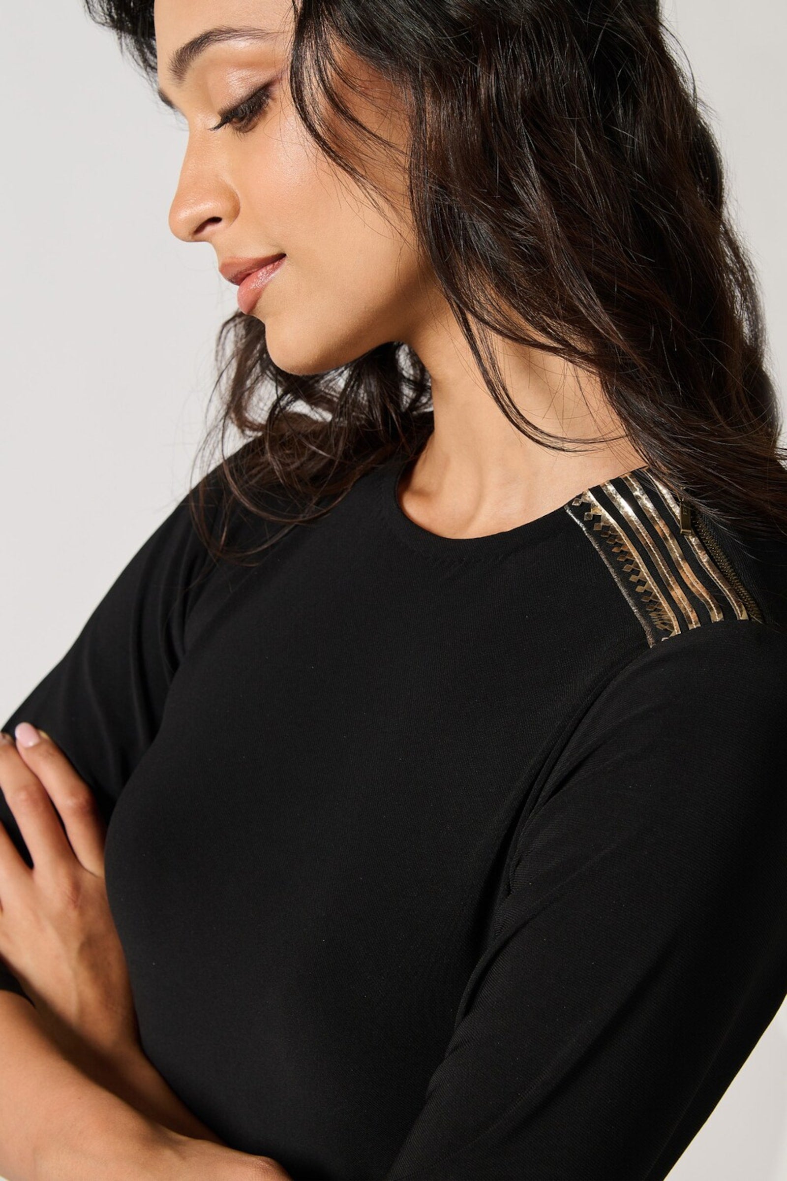 This sartorial piece strikes a perfect balance between structure and fluidity. The black dress features embroidered shoulder and colour block details making it a perfect pick for celebration wear. Accessories such as belt is used for styling purpose only.