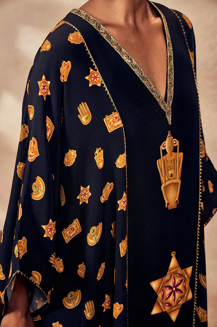 Kaftan- Black Trinkets patchwork kaftan adorned with embroidered border and kinari gota | Asymmetrical elbow sleeve | 'V' neckline |