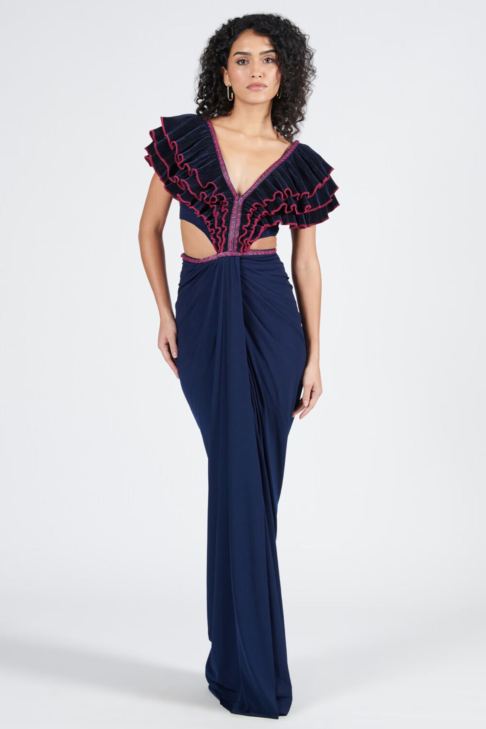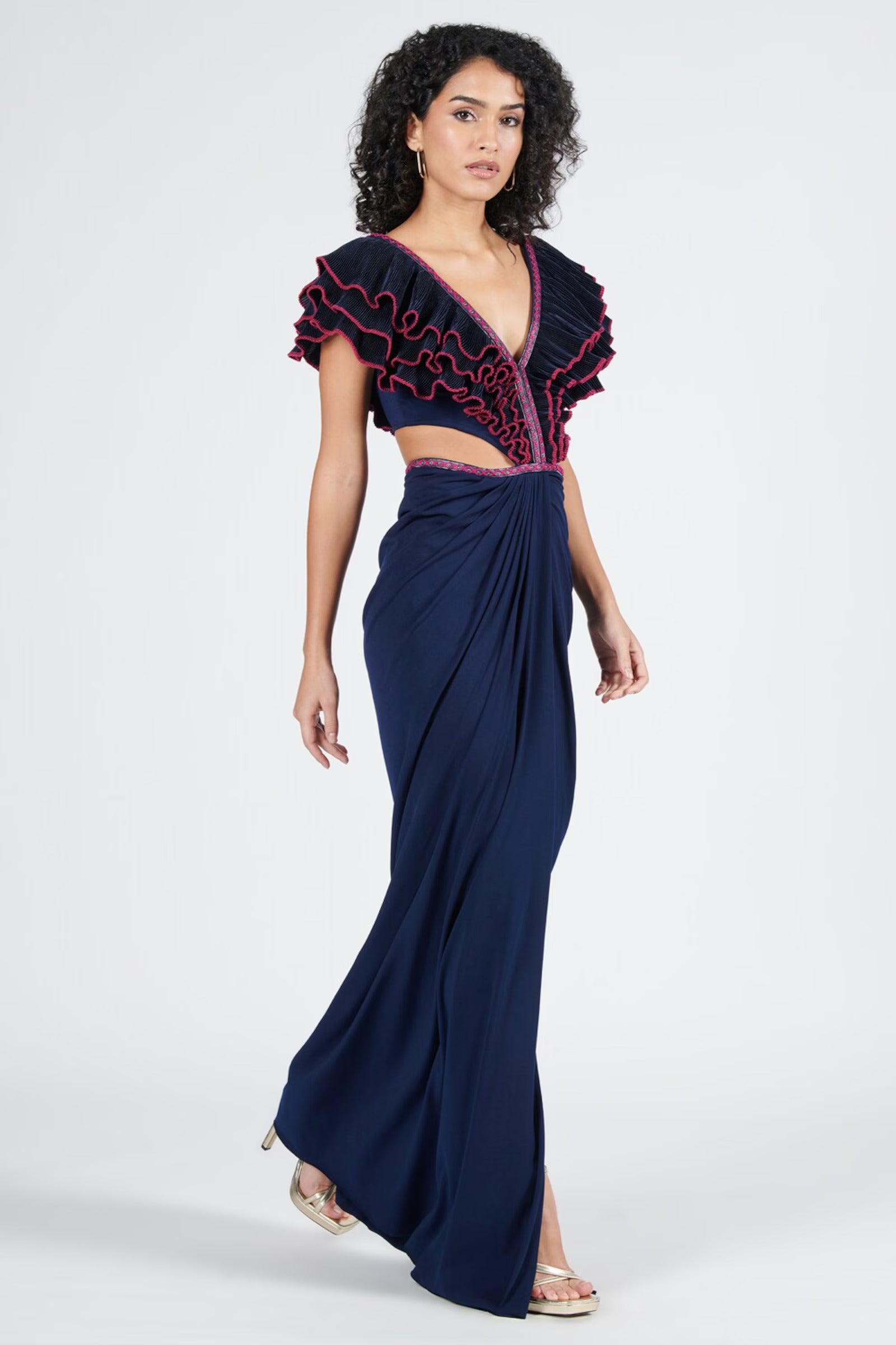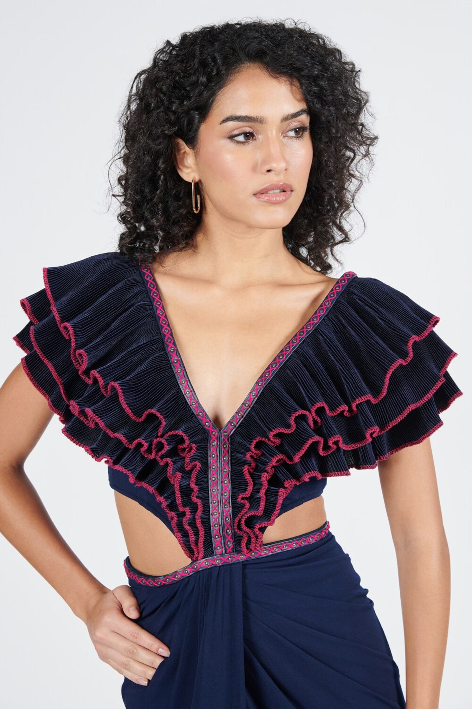Navy flounced gown with exaggerated frill details. The faux leather details along with metallic gold embellishments add a bold look to the gown.