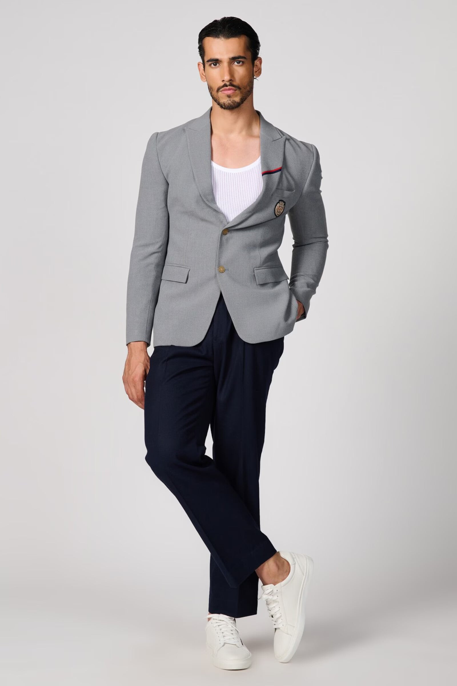 Shantnu Nikhil Cricket Club exclusive. This grey jacket is curated to preserve cricket's stylistic hallmark and empower a culture where cricket is celebrated as a lifestyle. An ode to the game, this jacket features SNCC crest.